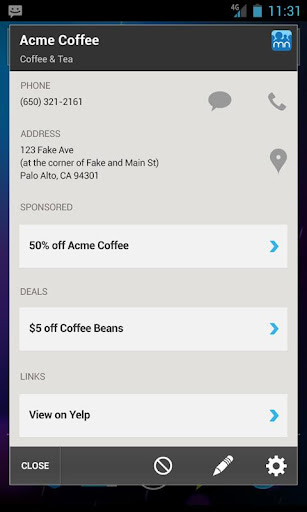 Ketika Anda mendapatkan panggilan dari lini bisnis, Mr. Number melakukan Caller ID bebas lookup untuk mencari nama. Jika kita tahu siapa yang dipanggil, kita akan menampilkan informasi tentang business, termasuk penawaran yang mereka miliki, lokasi mereka dan link ke situs Web mereka. (Anda juga dapat memblokir bisnis dari menelepon Anda dengan sekali tekan.)